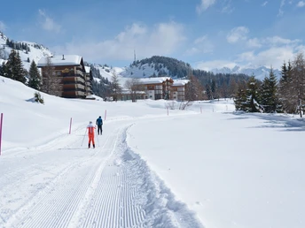 There are two routes to the cross-country trail from the mountain station of the Riederalp Mitte cable car: either follow the path opposite the station that leads up past an isolated chalet, or head west as far as Hotel Riederhof and take the small road to the right of the hotel. The cross-country ski trail offers a kilometre or so of the finest cross-country skiing with magnificent mountain views.