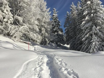 Via Egga you walk in the direction of Holzji, where you can observe wild animals from the wildlife observation post. Continue through the snow-covered forest to a clearing from where you can enjoy a unique view of the Great Aletsch Glacier. Walk along the path to your destination, the Aletschbord, and enjoy the panoramic view of the Valais mountains and the largest ice flow in the Alps.