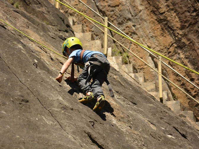 This sunny beginner's area is family-friendly and perfectly secured. In the grippy gneiss slabs, children can also take their first steps in lead climbing, practise abseiling and learn how to belay.