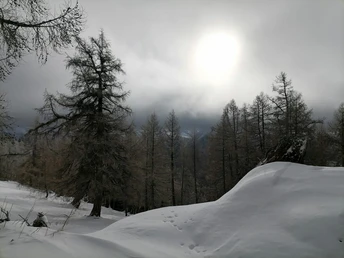 It is possible to start the snowshoe hike from Finnu (above Eggerberg). The trail leads through a hollow, past the uppermost chalets into the forest towards Chastler, an open plateau with a group of alpine houses. Continue uphill to the village of Sättle, where the trail joins the one from Mund.