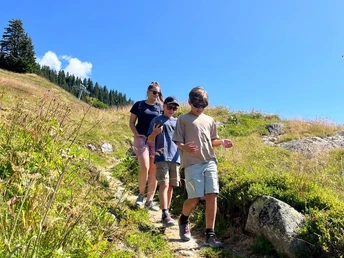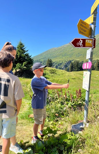 Tout au long du parcours, tu trouveras des panneaux du sentier audio qui te permettront d'écouter les dernières aventures de la petite sorcière de Belalp, Vero.