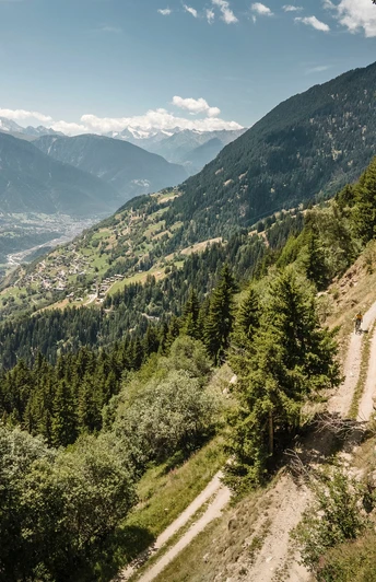 Tourstart ist beim ÖV-Hub Fiesch. Durchquere den Ort und folge der ungeteerten Strasse nach Lax. Ab dem Deischbach geht es auf der Martisbergerstrasse bergauf bis auf Höhe Ritti, wo du links auf die Waldstrasse wechselst. Über den Weiler Egga fährst du nach Betten und weiter nach Goppisberg. In lang gezogenen Serpentinen geht es nun – vorbei an den Weilern Bodu, Gstalji, Bina und Biel – hoch auf die Riederalp. Von dort fährst du ostwärts über die Aletschpromenade nach Bettmeralp. Auf Höhe der Luftseilbahn-Station wechselst du auf die talwärts führende Strasse zum Weiler Domo. Dort nimmst du den links abbiegenden Waldweg und fährst durch den Baderwald nach Martisberg. Hier beginnt die Abfahrt Richtung Fiesch: Nach der ersten Haarnadelkurve zweigt links ein gut fahrbarer Singletrail ab, der nach kurzer Zeit wieder auf die Martisbergerstrasse trifft. Alternativ bleibst du einfach auf der geteerten Strasse. Im Tal angekommen, bikst du auf der Landstrasse zurück nach Fiesch.