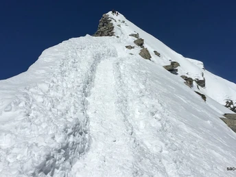 Simplonpass – Zurück zum Ski-Depot und ab dort rund 3 km Abfahrt geniessen. Oberhalb der Spaltenzone zuerst gegen Westen, dann gegen Südwesten der Felswand entlang bis auf rund 2’620 m abfahren.