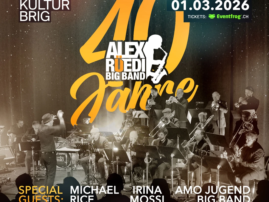 Seit 1986 steht die Alex Rüedi Big Band für mitreissenden Bigband-Sound, energiegeladene Live-Musik und echte Leidenschaft für Jazz. Als musikalischer Brückenbauer zwischen Ober- und Unterwallis verbindet das zwanzigköpfige Orchester Menschen, Stile und Regionen über Sprach- und Talschaften hinweg. In diesem Jahr feiert das zwanzigköpfige Orchester sein 40-jähriges Bestehen – und lädt aus diesem Anlass zu einem besonderen Konzertwochenende ein.