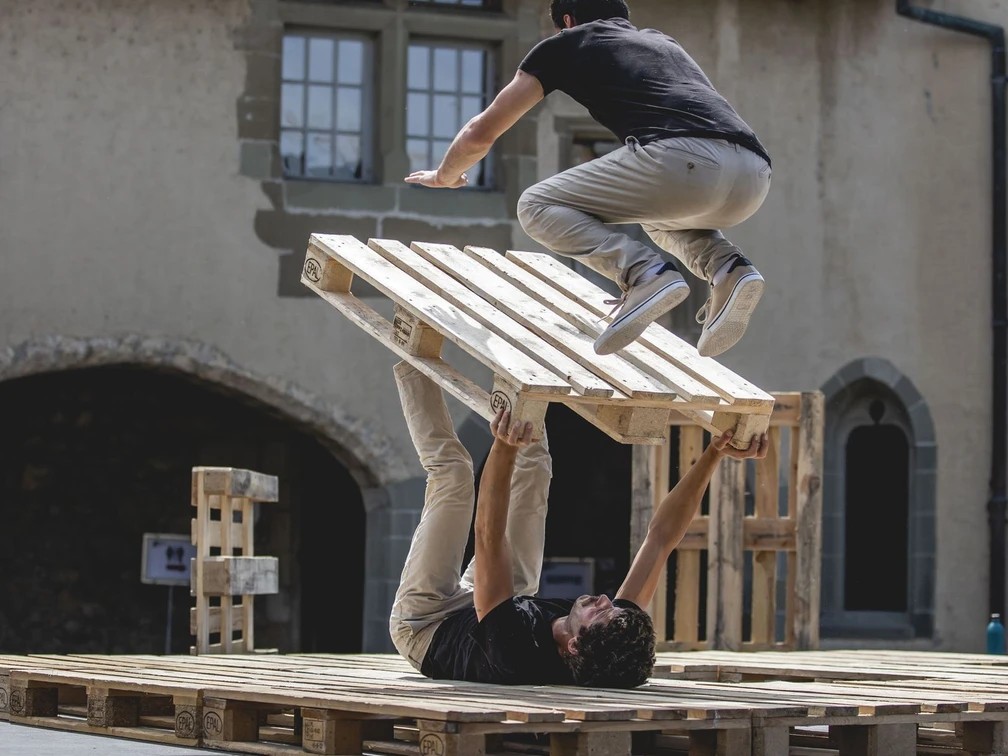 Mit dieser Aufführung für das breite Publikum wollten Cédric Gagneur und Marc Oosterhoff Paletten ein anderes Leben geben, jedoch ohne sie in Hipster Barmöbel oder Bio-Tomatenbehälter zu verwandeln.