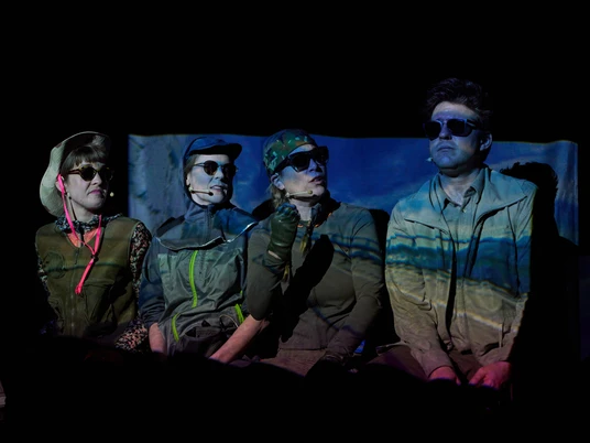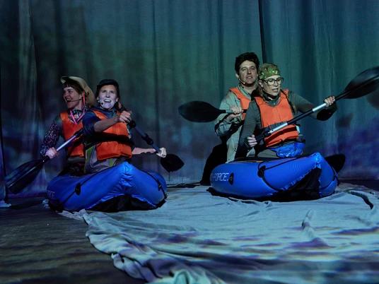 Auf der Bühne treffen die vier Hauptfiguren auf 16 ambitionierte Laienschauspieler*innen, die per Videoprojektion auftreten. Begleitet von Live-Musik verwandelt sich die Schlucht in einen mythischen und unheimlichen Ort, an dem die Grenzen verschwimmen.